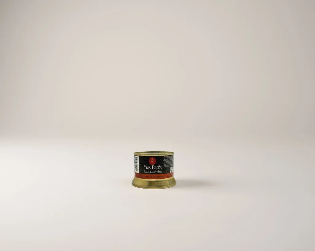 Hígado graso de pato sazonado, emulsionado y sometido a un tratamiento térmico de pasteurización. Presenta una capa transversal de gelificado de Pedro Ximénez.